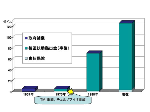 - TMI原発事故とチェルノブイリ原発事故の後には事業者間相互扶助による拠出金が大幅に引き上げられ、事業者の責任制限額は72億ドルに達しました。現在はさらに引き上げられて125億9448万ドルになっています。