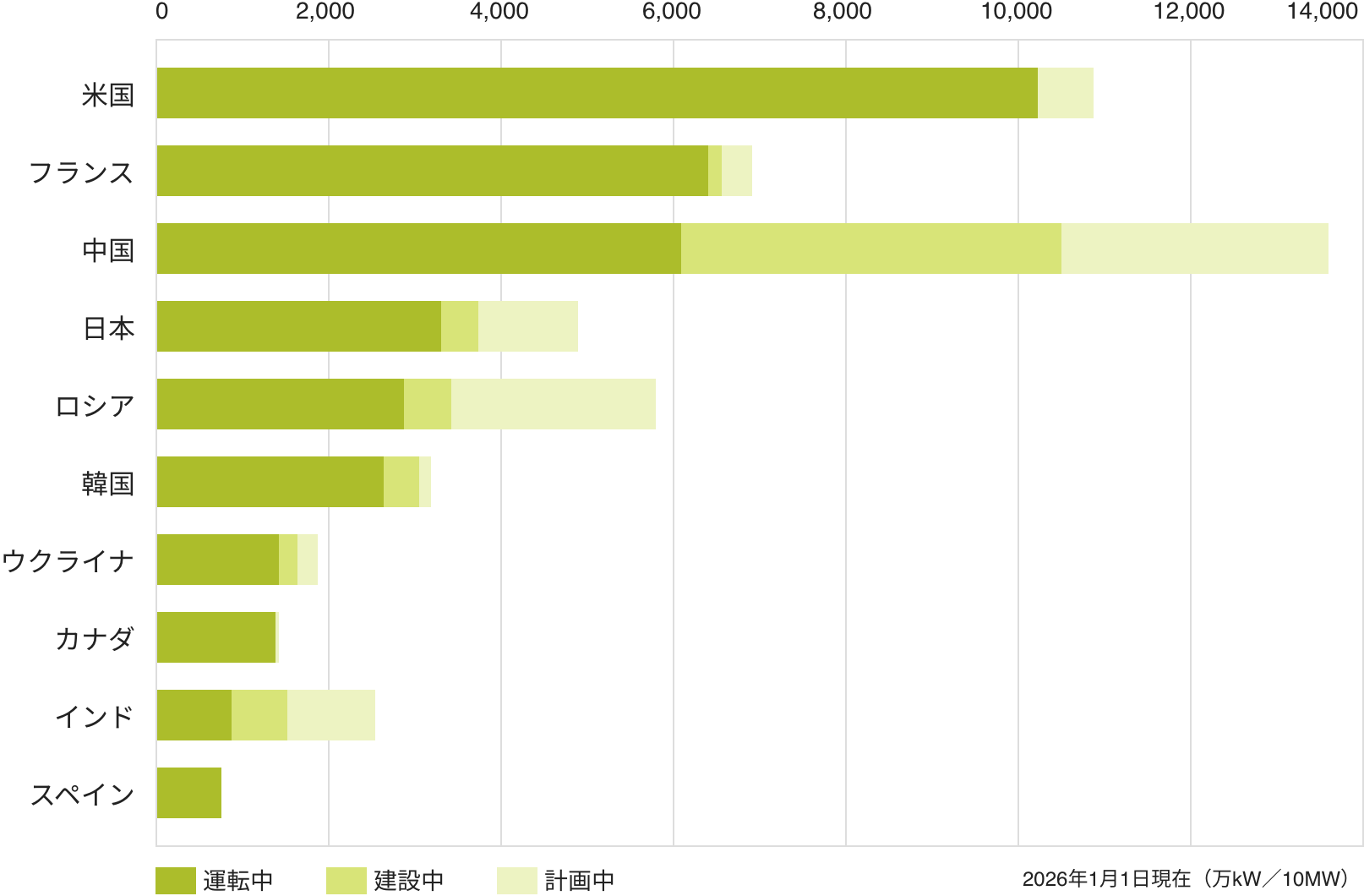今回の調査対象期間中(2025年 1月2日~2026年1月1日)、中国では 1基が営業運転を開始したほか、9基が着工、10基が新たに計画入りした。前年は 6基が着工しており、引き続き積極的な原子力開発路線を堅持している。ロシアでも前年に引き続き、第三世代+(プラス)の 120万 kW級ロシア型PWR(VVER)が1基着工したほか、第三世代+の最新設計「VVER-TOI」を採用した1基が初めて送電を開始した。さらにロシアは今後、大型炉、中型炉、SMRなどを大規模に建設する計画である。