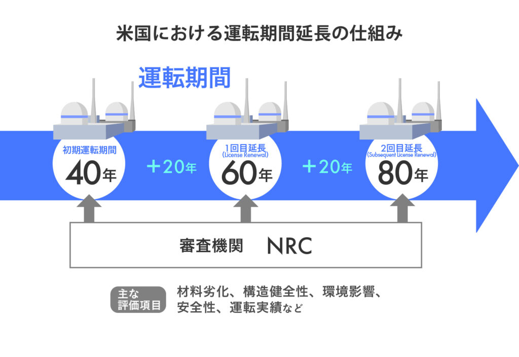 米国では、原子力発電所の初期の運転認可期間は40年とされていますが、これは技術的な制約ではなく、主に経済性を考慮して設定されたものです。運転期間延長の申請はあくまで自発的なものであり、プラント所有者が規制当局の原子力規制委員会(NRC)が要求する技術要件やその費用を勘案し、判断します。