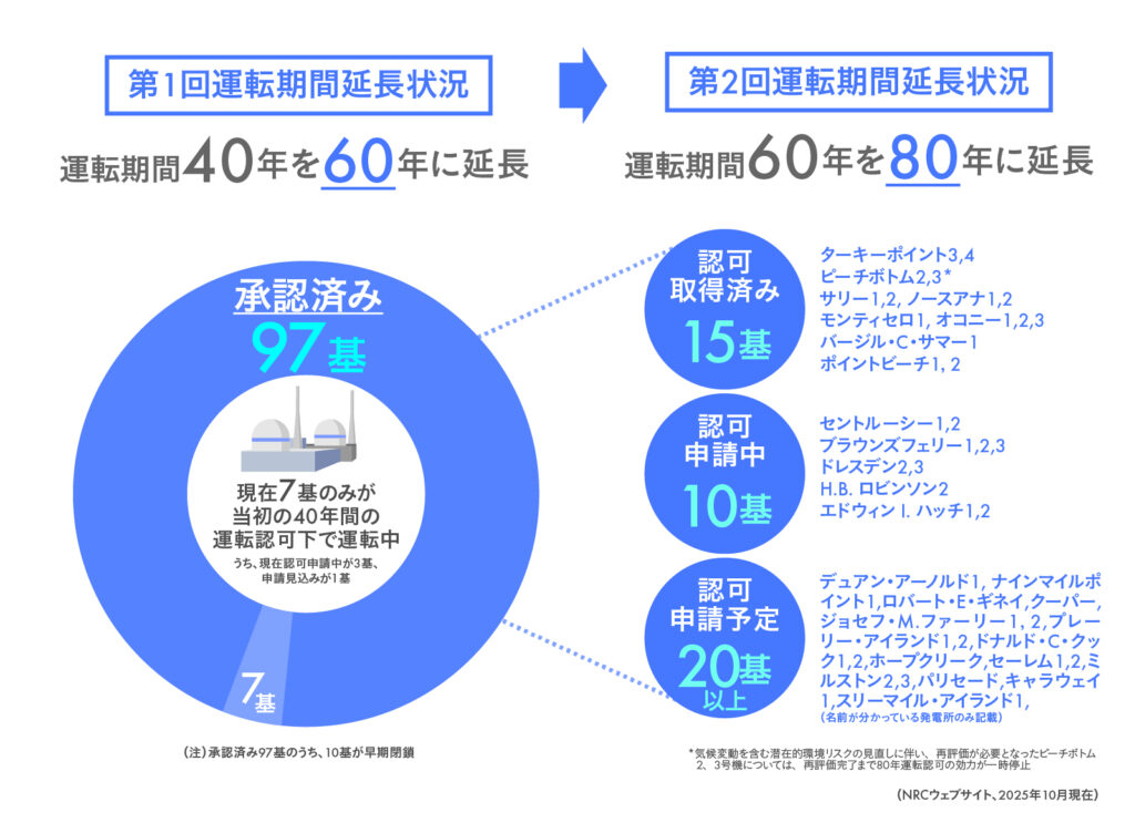 世界最大の原子力発電国・米国でも、既存炉の長期運転が加速しています。米国では、既存炉の有効活用策の一つとして、原子力発電所の運転期間を20年延長する措置が一般化しており、これまでに計97基のプラントが運転期間延長の認可を取得しています(うち、10基が早期閉鎖)。2025年10月現在、運転中のプラント94基のうち、87基(合計出力:9,414.9万kW)が運転期間延長の認可を取得済みで、3基(同349.2万kW)が申請中、1基(同121.0万kW)が申請予定です。また、米国では2度目の運転期間延長も可能となっており、このうち15基*(同1,392.2万kW)が80年運転の認可を取得しています(*気候変動を含む潜在的環境リスクの見直しに伴い、再評価が必要となったピーチボトム2、3号機については、再評価完了まで80年運転認可の効力が一時停止)。さらに、現在10基(同1,036.7万kW)が申請中であり、20基以上が将来の申請予定を表明しています。