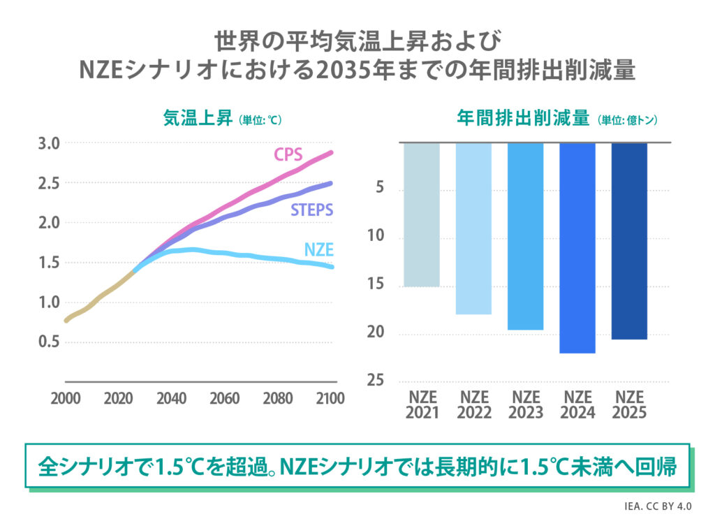 さらに、気候目標について報告書は、世界の平均気温がいずれのシナリオでも1.5℃を超過すると指摘しています。気温上昇は、電力インフラの障害などエネルギー安全保障上の脆弱性をもたらす可能性があるとする一方、NZEシナリオでは、長期的に気温を1.5℃未満へ戻すことも可能としており、最悪の事態を回避する余地は残されているといいます。