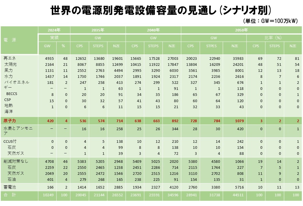 発電分野では、すべてのシナリオで太陽光を中心に再生可能エネルギーが最速で成長するものの、原子力発電も復活の兆しを見せています、2035年までに世界の原子力発電設備容量は2024年の4億2,000万kWから少なくとも3割増の5億6,300万kWに拡大する見通しです。2050年の原子力発電設備容量は、CPSで7億2,800万kW、STEPSで7億8,400万kW、NZEでは10億7,900万kWに増加すると予測されています。原子力の発電シェアは、いずれのシナリオも約10%程度となる見込みです。