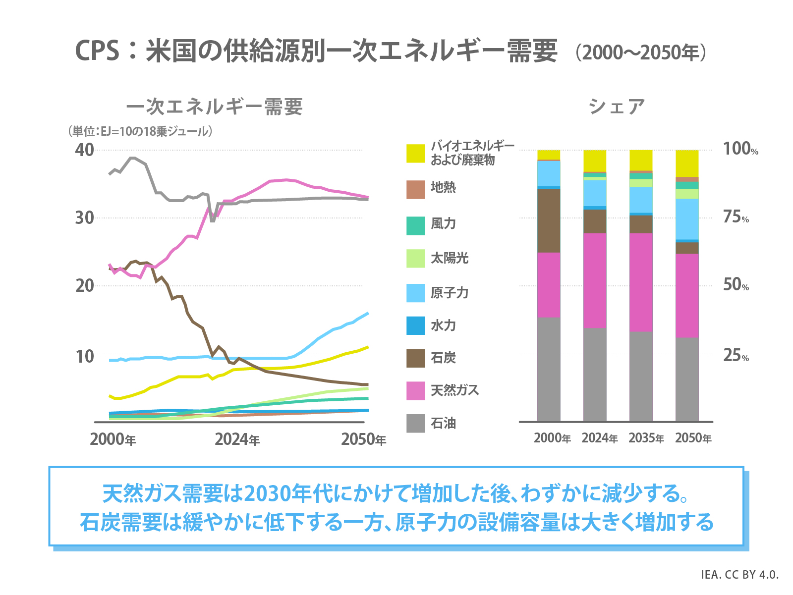 現行政策シナリオ(CPS)では、米国の一次エネルギー需要は2035年まで年率0.5%増加すると予測されており、過去20年間の概ね安定した需要から成長へと回帰する。天然ガスは2035年にかけて需要が大幅に増加し、2050年まで米国最大のエネルギー源であり続ける。石油需要は中期的に緩やかな増加が続くものの、長期的には横ばいになる。一方、石炭は2050年に向けて着実に減少する。原子力発電は、短期的には安定しているが、2030年代には現在開発中の大型炉および小型モジュール炉(SMR)が、政策的支援とテクノロジー企業からの強い関心を背景に相次いで稼働を開始し、新たな波が到来する。この原子力の復活は、建設および燃料分野における労働力とサプライチェーンの継続的な発展にかかっている。バイオエネルギーは2050年まで最大の再エネ源であり、太陽光発電と風力は近年と比べて緩やかであるが、拡大が続く見通し。