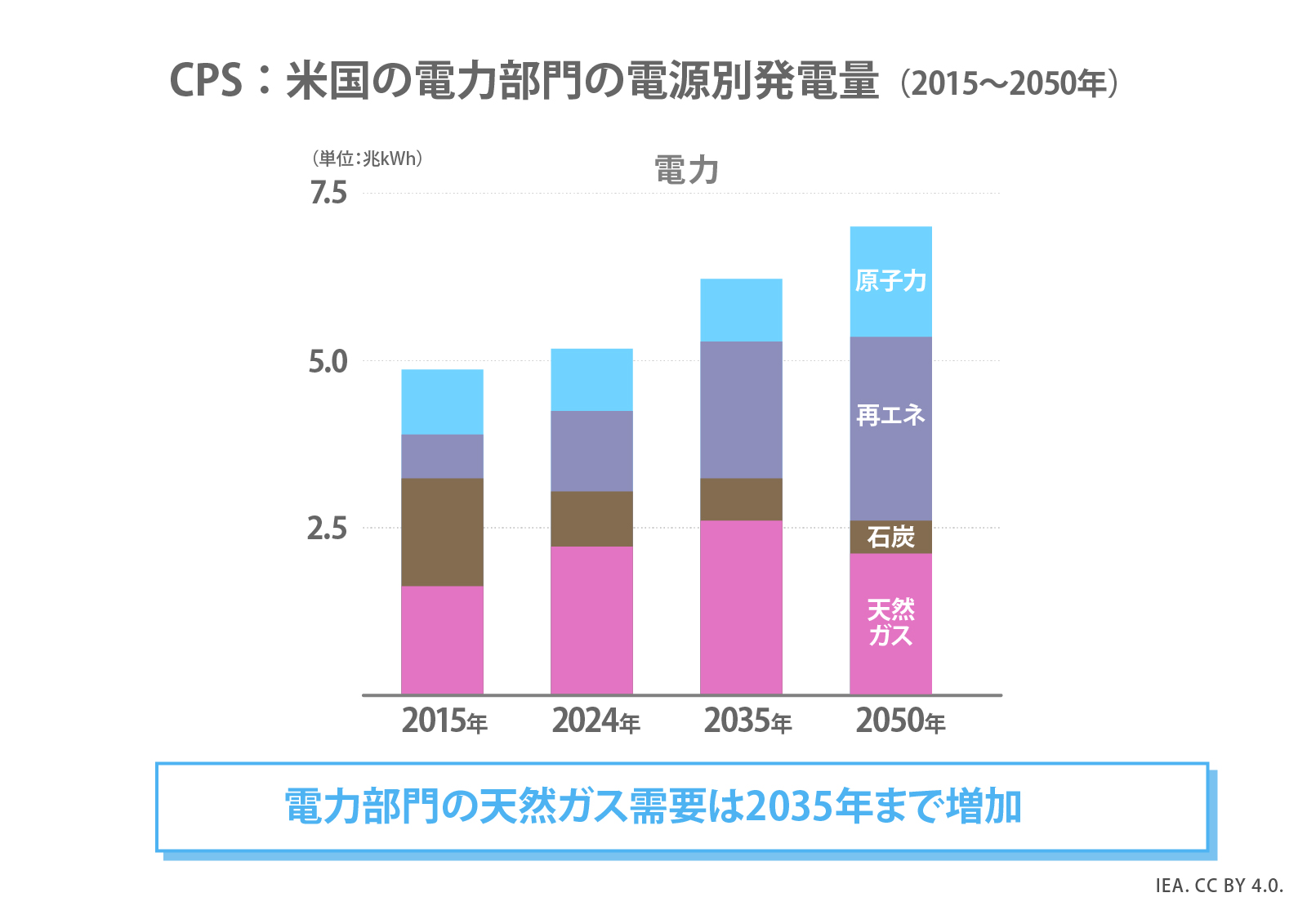 米国の電力部門および各最終需要部門はそれぞれ独自のエネルギーミックスを有しているが、CPSではいずれの部門においてもエネルギー需要の増加が見込まれている。電力分野では、天然ガス需要が2035年まで増加を続け、2050年に至るまで最大の発電源であり続ける。一方で、次世代地熱、バイオエネルギー、水力、太陽光発電、風力といった幅広い再エネ技術についても、需要の拡大が見込まれている。