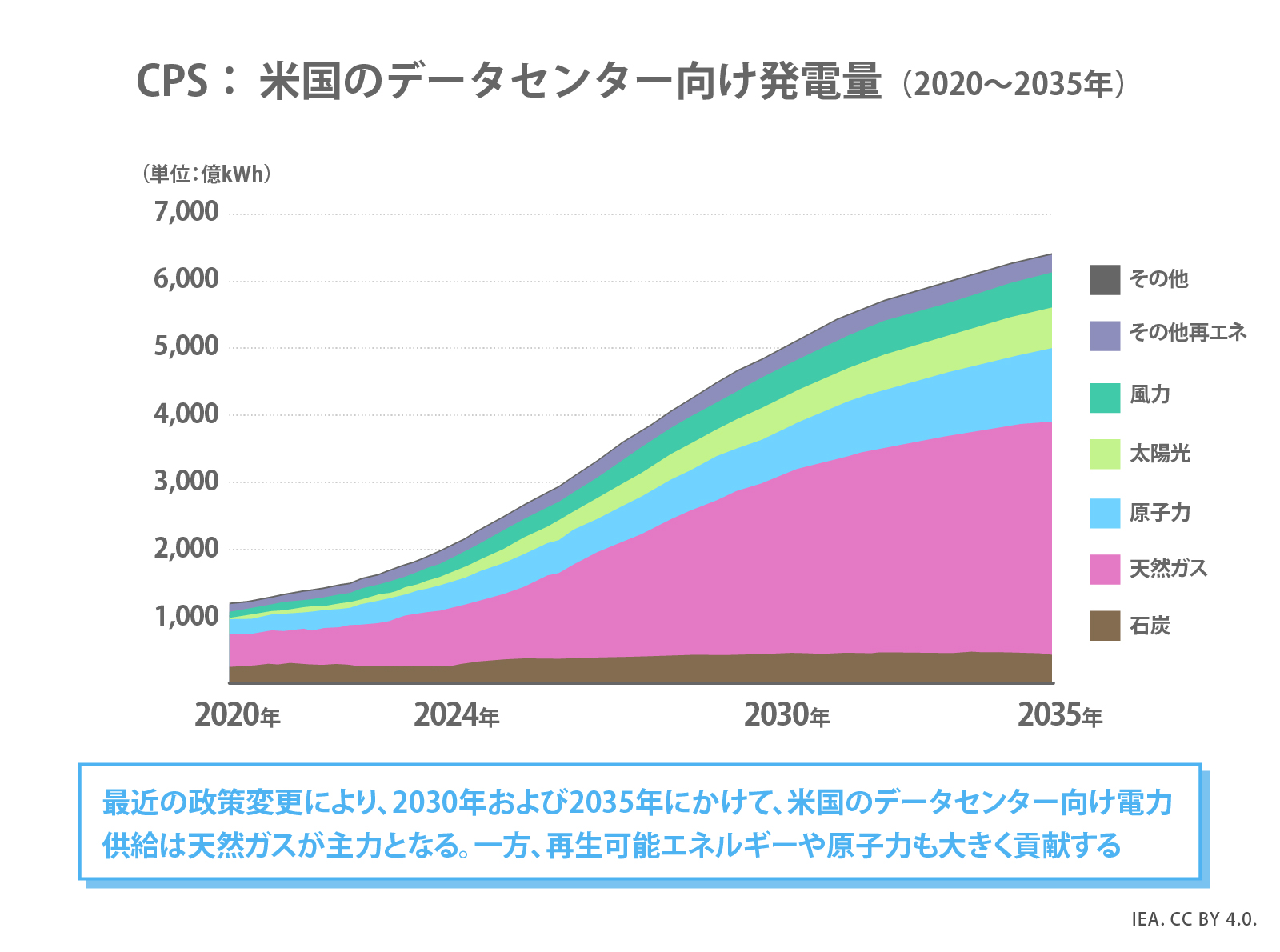 CPSでは、データセンター向けの電力供給量は現在の約2,000億kWhから2035年には6,400億kWhに3倍以上に増加する見通しである。新たなデータセンター需要に対応するため、天然ガス火力による発電が最も増加し、2035年までに2,600億kWhに拡大する。この増加の多くは2030年以前に生じる。こうした動きは、天然ガス需要の継続的な拡大を反映したものであり、その大部分は、既存の系統接続済みガス火力発電所の稼働率を引き上げることで賄われる。また、一部の開発事業者は、大規模なデータセンターを専用の天然ガス発電所と共同立地させる計画もあるが、ガスタービンのサプライチェーンの制約により、これらのプロジェクトの一部は2030年以降にずれ込む可能性がある。