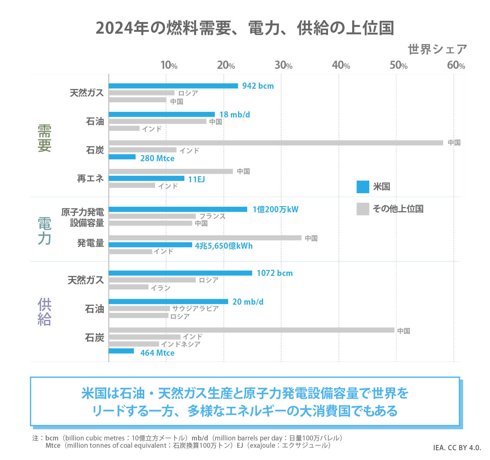 米国は、石油と天然ガス需要の両方で世界トップである。石炭需要で世界3位、再生可能エネルギーは2位にランクされている。米国は世界第2位の発電国であり、中国の半分の発電量であるが、インド(3位)の2倍以上である。米国はまた世界最大の原子力発電所群を運転しており、その発電設備容量は現在1億kWを超えている。