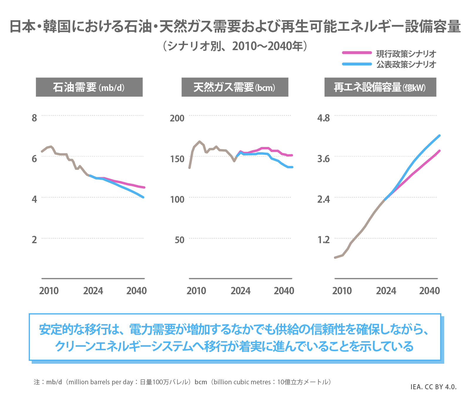 両国で低排出燃料とエネルギー安全保障の強化に向けた政策支援により、化石燃料需要は2024年から2040年にかけてCPSで年平均1.5%、STEPSでは年平均2%以上減少する。同地域のエネルギー関連CO2排出量はその過程でわずかな変動があるが、2014年以降減少しており、この傾向は両シナリオにおいて継続する見通しである。2040年には、この地域のエネルギー関連CO2排出量は、CPSでは現在より30%超、STEPSでは40%低い水準となる。