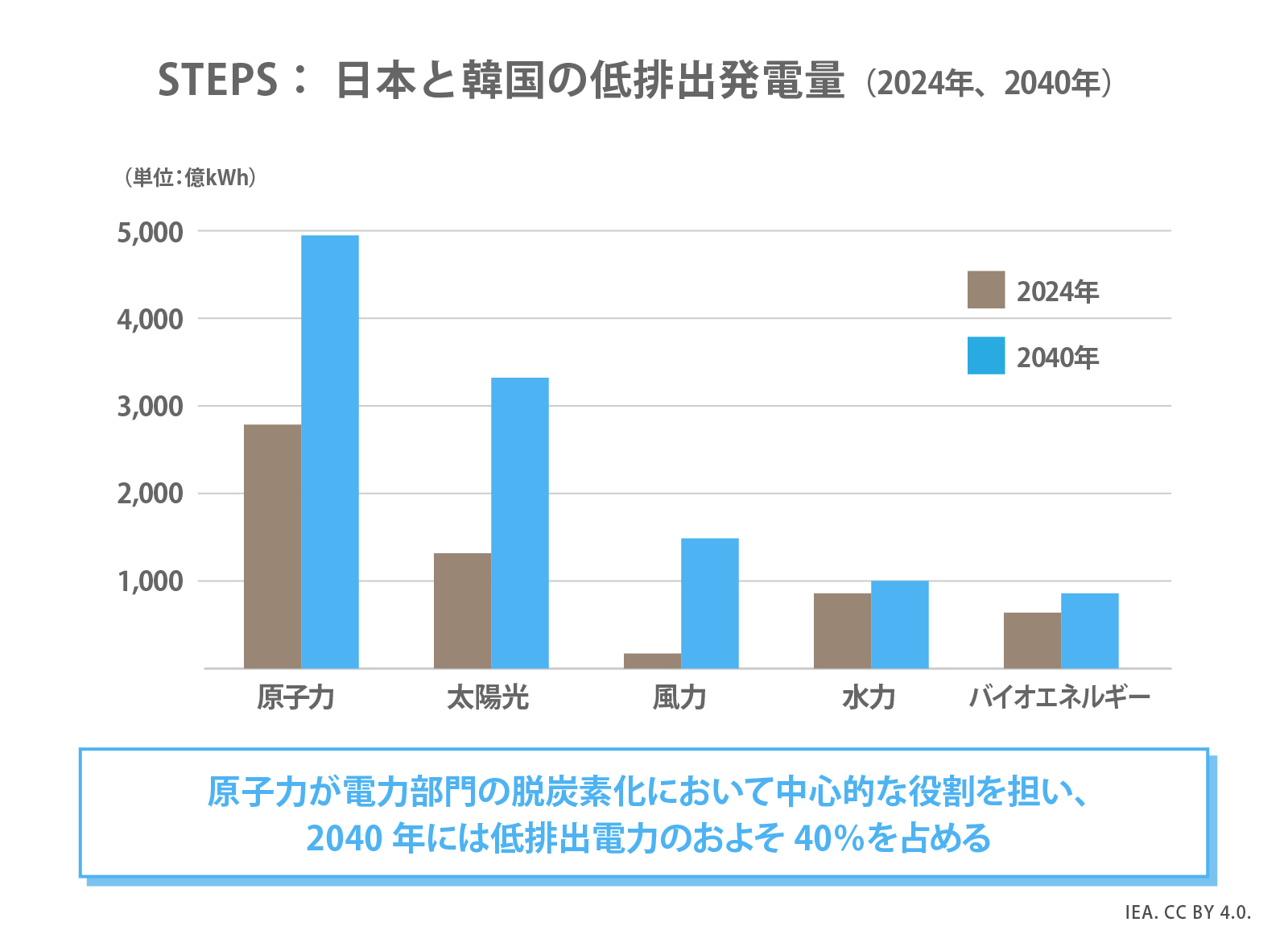日本と韓国は、脱炭素化、エネルギー安全保障、手頃な価格を支援するため、安定的かつ低排出な技術に対する投資家の信頼を高めるべく、さまざまな施策を追求している。原子力発電はそのような技術の一つである。両国は、変動性の再エネを補完し、脱炭素化目標の達成、エネルギー自給の強化、および化石燃料輸入費用の削減に資する、需給調整可能で低炭素の供給源として、原子力発電を推進している。現在、原子力はこの地域で2,800億kWhの電力を供給しており、これは太陽光発電、水力、風力といった他の主要な低排出電源による発電量の合計に匹敵する。どちらのシナリオでも、原子力は地域最大の低排出電源であり、2040年には約5,000億kWhに達すると見込まれている。日本の当面の優先課題は、新規建設計画の発表に加えて、既設原子炉の再稼働を進め、発電量に占める原子力比率を引き上げることである。韓国では、建設中の2基の新設(セウル3号機と4号機)を進めることが優先課題である。仮に原子力開発が遅れ、発電量が現状の水準にとどまった場合、2040年にはこの地域で1.8億kW超の追加の太陽光発電設備、あるいは40bcm(400億立方メートル)の追加的な天然ガスが必要となる。