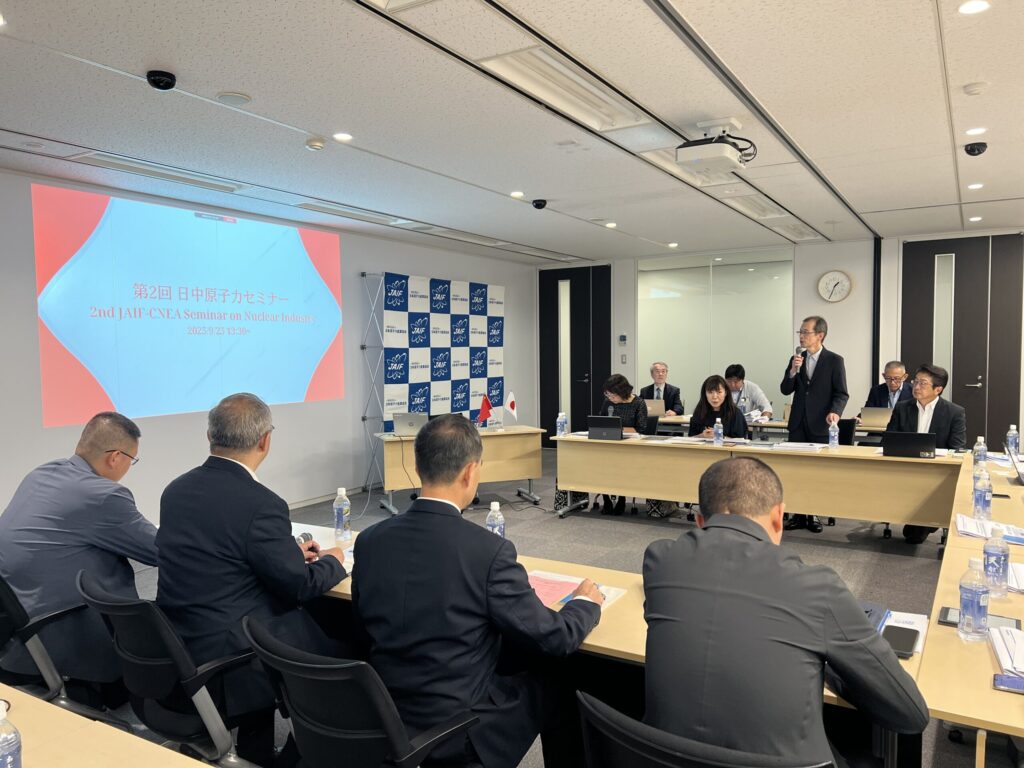 原産協会は9月25日、中国との協力活動の一環として、中国核能行業協会(CNEA)と共催で「第2回日中原子力産業セミナー」を日本にて7年ぶりに対面開催いたしました。中国側からは、CNEA曹述棟常務(常勤)副理事長をはじめ、中国核工業集団有限公司、中国広核集団有限公司、中国華能集団有限公司、香港核電投資有限公司、清華大学など関連企業・機関から16名が参加しました。日本側からは、当協会の増井秀企理事長をはじめ、日本原子力発電(株)、電気事業連合会、日本エヌ・ユー・エス(株)、海外電力調査会など、関連企業・機関から約43名(オンライン傍聴を含む)が参加しました。