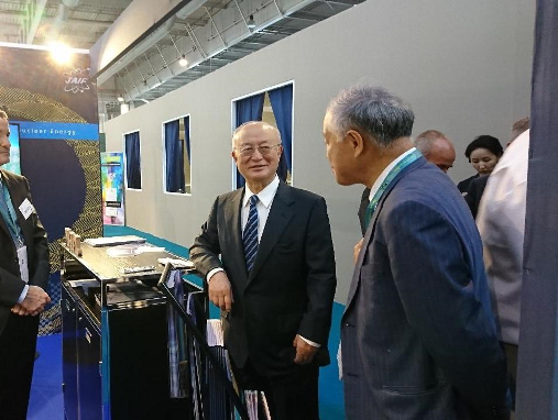 日本からは、三菱重工業のほか、日立GEニュークリア・エナジー、原子力国際協力センター(JICC)、および当協会がブースを出展しました。当協会のブースでは、『日本の原子力産業バイヤーズガイド』を配布し、日本のサプライチェーンや会員企業・組織の紹介を行いました。仏企業や英企業を中心に、日本の市場に興味を持つ多くの企業がJAIFブースを訪れました。また、JAIFブースに天野IAEA事務局長が訪問され意見交換を行ったほか、この機会にFORATOMデバゼイユ事務局長やFOROアラルース理事長等と懇談を行いました。