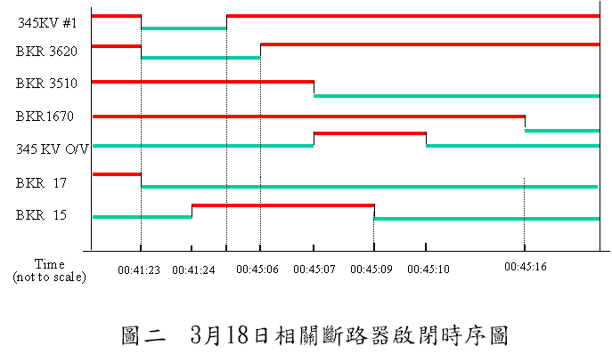第3発電所交流電力系統の配置図は、(図1) のとおりである。1号機の事故発生の起点は、主電源母線である。基本的に、2系統の主電源母線の設計は、安全システムが具備すべき多重設置の要求条件を満たしており、いずれか一方が故障した場合には、他の一方が給電作業を実行することができ、安全が損なわれないようになっている。原子力の安全性という観点から、今回の事故について、最も検討を要する問題は、なぜ2系統の主電源母線が同時に外部の交流電源を喪失し、しかも当時161kVの外部電源には、異常な現象がなかったのかという点である。事故発生後の主電源母線Aの現場調査によれば、第17号と第15号のブレーカーには、大きな破損が生じている (写真1、2、3)。また、事故発生前のブレーカーの受電状況から見ると (図2)、00:41〜00:45の間の161kV電源は正常な状態であることから、15号ブレーカーは、最初の故障箇所ではない。00:45:06秒の時点で、3620ブレーカーをクローズし、その直後00:45:07秒の時点で、3510ブレーカがあがっており、このことから、最初の故障箇所は、第17号のブレーカーであると考えられる。 また、主電源母線Aの現場から発見されたこととして、第17号ブレーカーの主電源母線口は、損害を受けておらず、電源側の接点の状況から見ると、第17号ブレーカー毀損の原因は、過電圧破壊であって過電流破壊ではなく、この結果により第17号ブレーカーは事故発生前、オープンの状態であったのであり、これは3620ブレーカークローズ後の事故発生タイミングからみても、合理的である。 以上の判断に基づいて、3月18日の事故発生過程として可能性があるのは、主電源母線A上であり、345kVを受電する17号ブレーカーに接地故障が発生し、アークが燃焼し、これが15号ブレーカーに波及したことから、第15号ブレーカーにも電源側の接地故障が発生したものである。ブレーカーの故障は、主電源母線Aの接地に至り、主電源母線Aは受電不能となった。このほかにも、ブレーカー3510と1670があがって、外部の161kVと345kVの交流電源が、共に主電源母線Bに送電できなくなった。 第17号ブレーカーが、オープンの状態で発生した事故であり、現場状況が、過電圧破壊に類似の状況にあることから、17号ブレーカーの絶縁の劣化が事故の原因である可能性がある。また、17号ブレーカーの毀損状態からみると、受電口B相の毀損が最も重大であり、このことから、17号ブレーカー故障の主たる原因として可能性があるのは、B相接点は、事故発生前から劣化しており、3月18日00:41における345kV中断の際には、当時の電圧超過が局部的なアーク現象を招き、この局部的なアークが接点付近の空気をイオン化し、開閉室内部が密閉空間であることから、空気イオン化の現象がすぐには消失しなかったという可能性がある。00:45に至って、3620ブレーカーをクローズして、345kVの送電停止をした際の電圧の過渡的状態が、当該ブレーカーを毀損したものである。このほか、現場は、アークにより大きく毀損されており、実証の収集が困難であることから、17号ブレーカーに機械的な故障があった可能性も、完全に排除することはできない。 発電所外部の345kV送電系統の不安定 (図3) の原因は、17号ブレーカーの絶縁劣化の可能性がある。分析によれば、345kVラインに過渡的状態が発生する都度、17号ブレーカーの受電口には、電圧超過の現象が生じ、電圧の範囲は、おおよそ7kV〜9kVの間である。こうした電圧超過時間の累積が、絶縁劣化の原因となった可能性がある。 17号ブレーカー絶縁劣化のもう一つの原因として可能性があるのは、ラインの共振 (別名:鉄共振、Ferro Resonance)である。原子能委員会の招請により調査に参加した専門家の発見では、3月17日20:38に発生した、345kV龍崎山ラインのダウン (図4) は、当時、第3原子力発電所における当該ラインに対応するブレーカー (3520と3530) はオープンしておらず、龍崎山ラインは、非常に長いため、このラインの等価キャパシタンス、等価インダクタンス、第3原子力発電所の変圧器起動リアクタンス等の相互作用により、ライン共振の現象が発生した。3月17日20:38における龍崎山ラインのダウン後、当時は、第3原子力発電所の2基の設備がともに停止状態にあったため、345kV系統は、電源を失った。しかしながら、第3原子力発電所開閉室の過渡的状態のレコーダーによれば、龍崎山ラインのダウン後、345kVラインには、約2秒間の電圧リーディング記録があり、当該電圧は記録器の範囲を超えるものであった。 ラインの共振を生じるもう一つの重要な要因は、第3原子力発電所原子炉の冷却水ポンプ (RCP) のフライホイール回転である。3月17日の20:38に345kV外部電線を喪失した際、第3原子力発電所1号機にある3台の原子炉冷却水ポンプが、フライホイールの慣性により回転し、この時に、電動機が発電機の機能に転じて、13.8kV系統に電力を逆送し、変圧器を起動させて345kVラインの電圧を上昇させる現象を引き起こし、こ