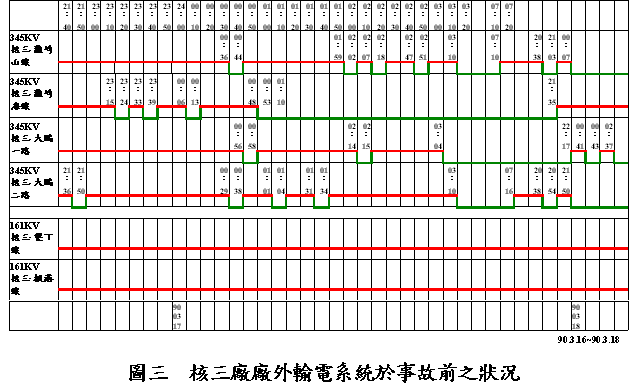 1.前言 3月18日0時46分、楓港、恒春地区における季節性の塩霧害の影響により、超高圧345kV送電線にトラブルが発生し、これにより台湾電力第3原子力発電所の外部電源が喪失、更に所内の安全交流電源系統が故障、予備のディーゼル発電機による給電も不能という状況のもとで、1号機の2系統の主電源母線が、同時に電源喪失となり、設備は台湾の原子力発電所緊急時計画における事故分類でレベル3A「緊急事故」の状態となった。現場の作業員が、すみやかに処理をおこなったため、放射能漏れ事故には至らず、02時54分に、第5ディーゼル発電機が、給電に成功後、事故は全て回復した。 今回の事故で、第3原子力発電所1号機の原子炉は、何ら影響を受けなかったが、2系統の安全系統が、同時に2時間8分にわたって機能を喪失したという状況は、20年以上におよぶ国内の原子力発電使用において、きわめて重視すべき非常事態である。原子能委員会は、事故発生後、ただちに各業務部門ごとに組織された共同調査チームにより、事故原因と影響についての調査を開始した。このほか、事故原因をさらに詳細に把握するため、原子能委員会の胡主任委員は、別途、清華大学の陳國誠教授に対し、10人のメンバーによる独立調査団を組織して、並行して事故原因を調査するよう依頼した。本報告摘要は、これら2件の調査結果による総合的な説明である。 2.事故の経過3月18日に発生した、今回の第3原子力発電所1号機の安全交流電源喪失事故についての経過概要は以下のとおりである。