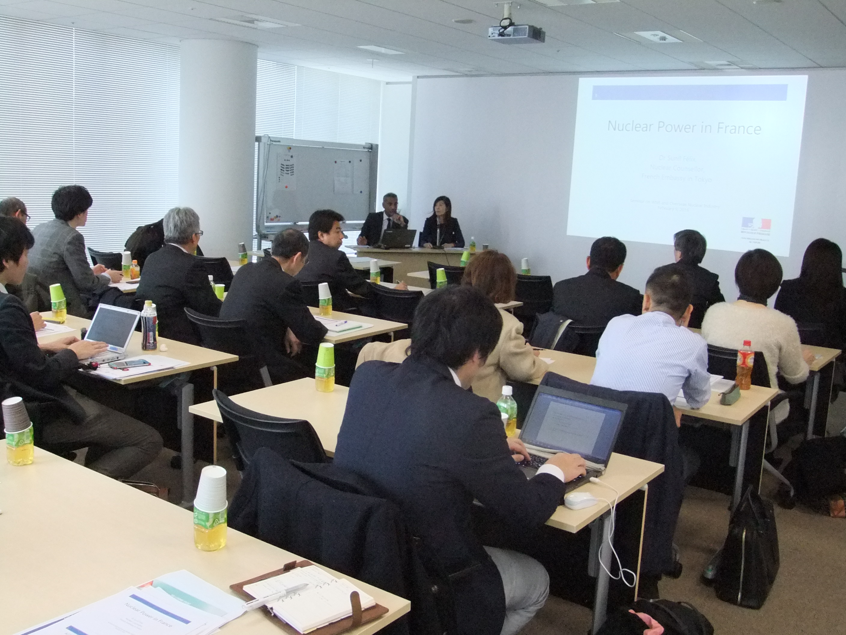 着任から最初の仕事が今回のプレゼンテーションとなった駐日仏大使館のS.フェリックス原子力参事官は、「フランスでは原子力界の再編成が起こり、日本では再稼働が徐々に進みつつあり、両国で様々な原子力に関する出来事が起こっている時にここにいられることは光栄」と挨拶した。将来のエネルギートレンドとして(1)スマートシティ化の進む工業国と人口増が見込まれる開発途上国のどちらも電気の需要は必ず増え、電力市場は成長する(2)新しい技術により個人や企業、地方自治体などが自分たちで電気の消費活動を行い、必要に応じて発電も行うようになり、電気は地域的かつグローバルなものとなる(3)緊急に対策が必要となる気候変動など環境への配慮から再生エネルギーとともに原子力の需要はゆっくりとではあるが増え続ける――ことを挙げた。
