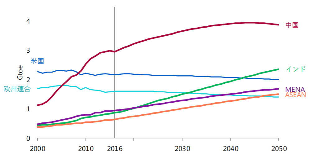 OECD加盟国全体では横ばいもしくは減少傾向で推移し、増分のほとんどは非OECD加盟国が占め、特に世界最大の消費国である中国は、2040年代半ばにエネルギー消費量が40億トン(同)弱でピークに達するとしている。一方、インド、ASEAN諸国、MENA諸国(中東・北アフリカ)は、急速な経済成長と人口増加に伴い、エネルギー消費量は堅調に増加し続け、中でもインドは2040年代半ばに米国と入れ替わり世界第2の消費国となる見通し。