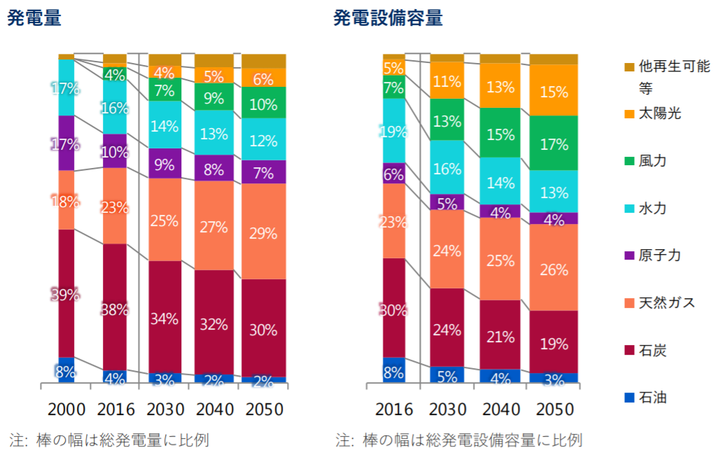 電力供給については、2050年に世界の発電電力量は2016年のほぼ倍増となり、再生可能エネルギーのシェアが伸びるものの、火力発電が中心となる大枠に変化はないとしている。原子力は、世界全体の設備容量で、2016年の406GWが2050年には518GWにまで、発電量も1.3倍に拡大するが、総発電量の急激な伸びには追いつかず、発電量全体の構成比では3ポイント低下するなどと分析した。