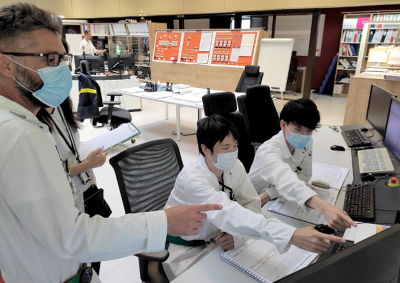 このため、日本原燃は二〇二一年からこれまでに8回にわたり、若い世代を中心に延べ約九十人の運転員をフランスのオラノ社の再処理工場へ派遣し、実証訓練と人材育成を積み重ねてきた(写真2)。案内役の岡村部長も過去にフランスに約1年間滞在し、ラ・アーグ再処理工場で実地訓練を受けた。「非常に有意義な経験だった」と語る。この運転員の実地訓練は運転能力や技術力の向上に向けて大きな経験値となり、いまではすでに実機運転の経験者が約6割を占めるまでになった。