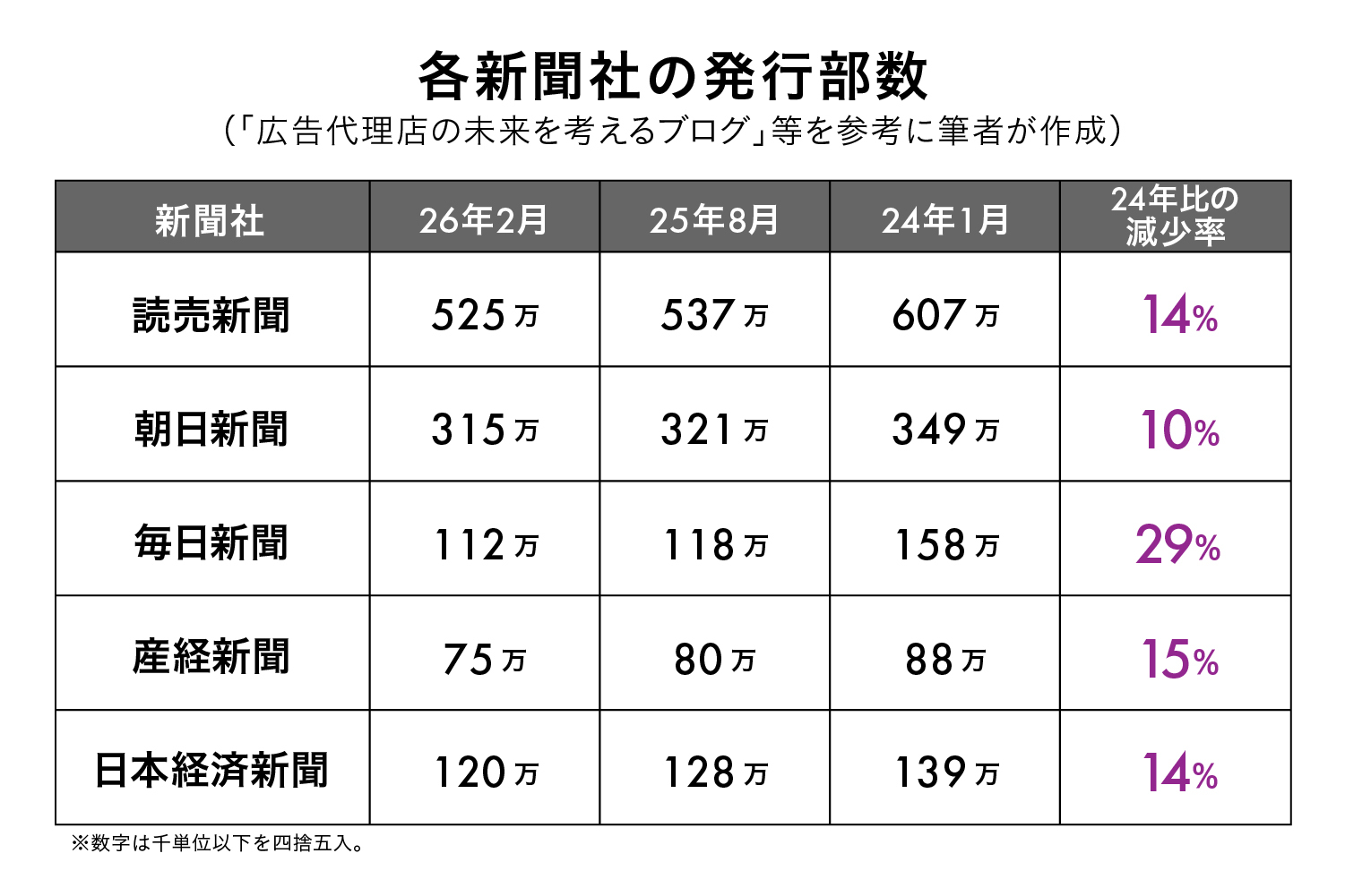 今年2月の新聞発行部数の速報(「広告代理店の未来を考えるブログ」参照)によると、読売新聞は約525万部(24年比14%減)、朝日新聞は約315万部(同10%減)、毎日新聞は約112万部(同29%減)、産経新聞は約75万部(同15%減)、日本経済新聞は約120万部(同14%減)だ。
