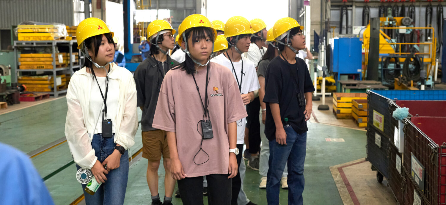 工場棟へ向かう通路に立つと、空気の温度がわずかに変わる。高天井に反響する作業音、フォークリフトが遠くで切るタイヤの鳴き、溶接の光を覆う遮光カーテンの縁。生徒たちはヘルメットを着用し、前後をスタッフに挟まれて列を組み、注意喚起と合図を合図で返しながら進む。写真撮影の制限と機密保持の説明は念入りである。「構内では決められた安全ルールを必ず守って行動してください」。その言葉は形式ではなく、場の空気の芯に通っている。