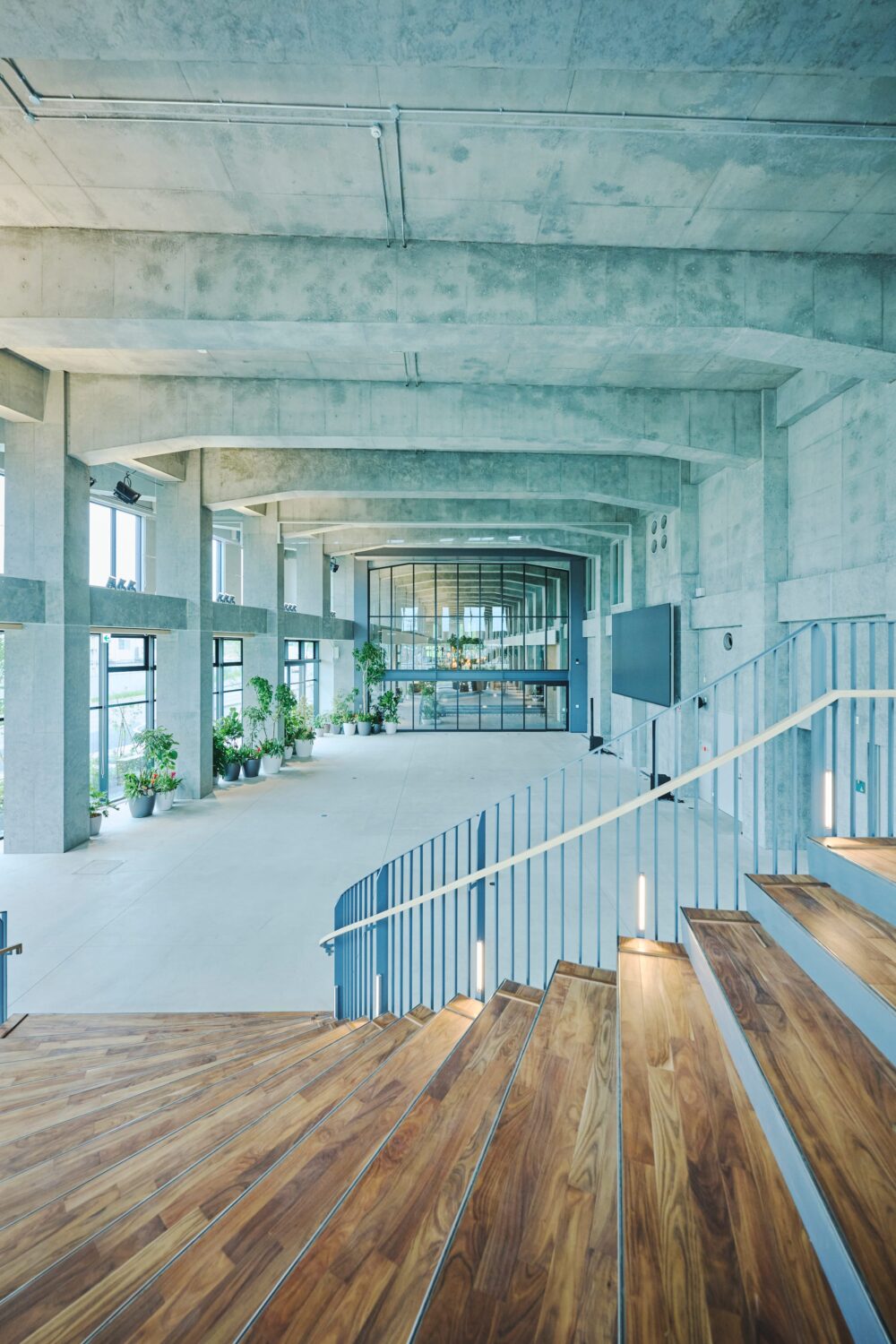 ノークオフィスには、オフィス機能に加え、シェアオフィスや屋内広場など多目的に利用できる空間を設けた。屋内広場には、約200インチの大型LEDスクリーンを備え、季節に応じたイベントなど、多様な用途に対応する。誰もが気軽に集まり、地域とのつながりを育む拠点としての活用を見込む。また、災害対策として、太陽光パネルや蓄電池、非常用発電機を設置し、有事の際には地域防災にも活用できる設備を備えている。