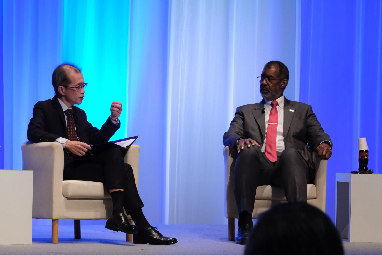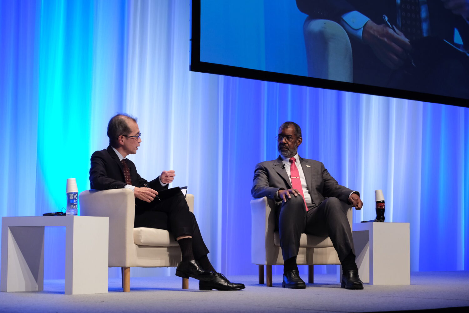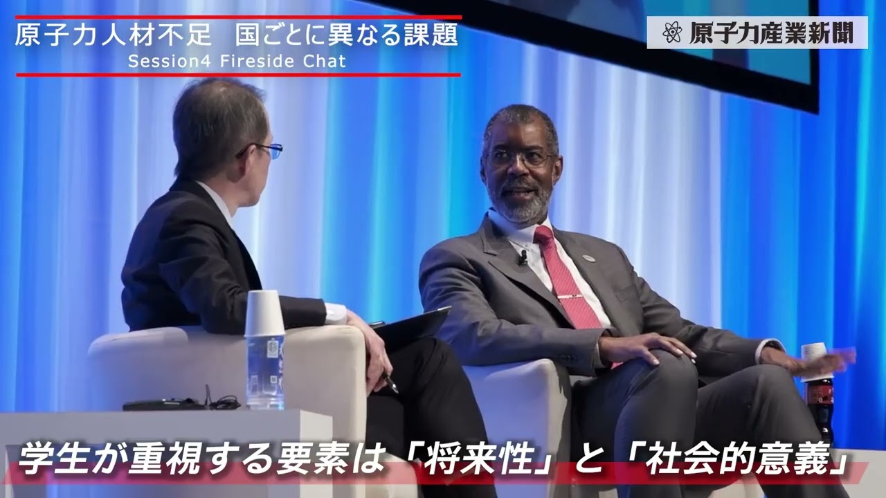 OECD/NEAとの共催で行われたセッション4の冒頭では、NEAのW.D.マグウッド事務局長と、日本原子力産業協会(JAIF)の増井秀企理事長による対談「ファイヤーサイドチャット」が行われた。原子力人材の確保をめぐる課題をテーマに、各国に共通する問題の構造や若年層への訴求の重要性について認識が共有された。対談は、その後に続くパネル討論の導入としての位置づけである。