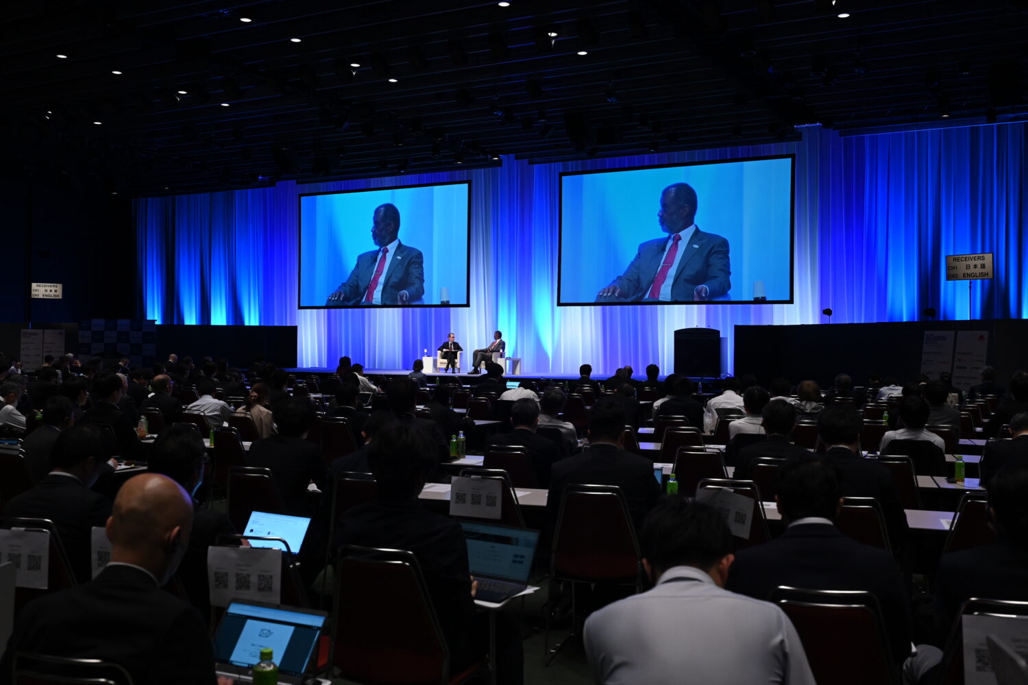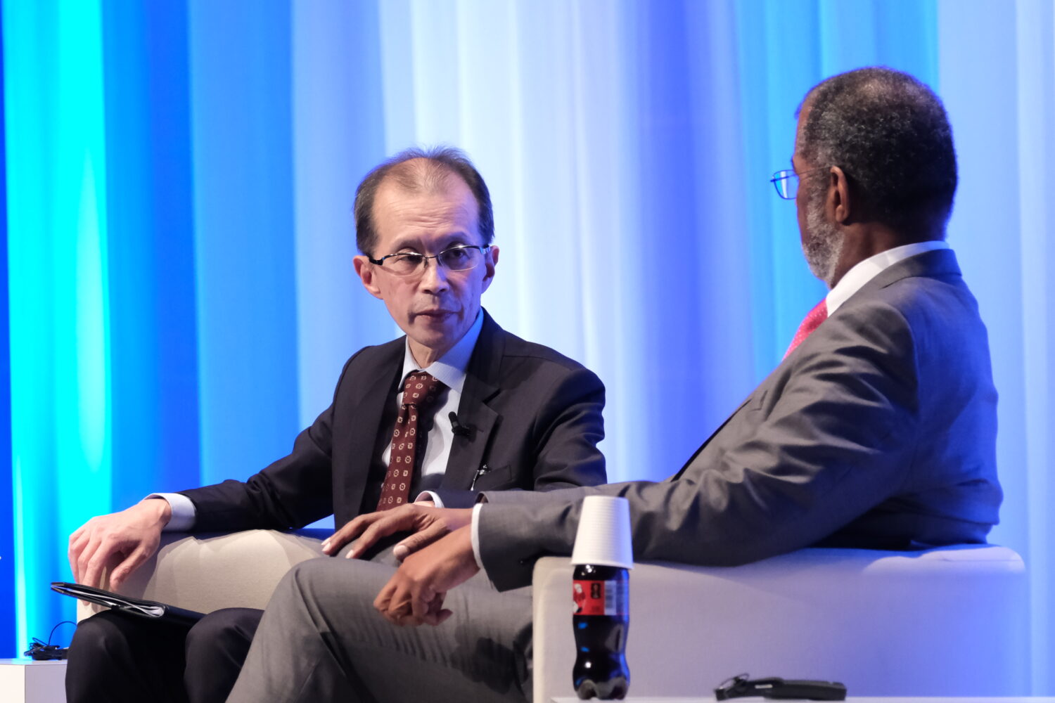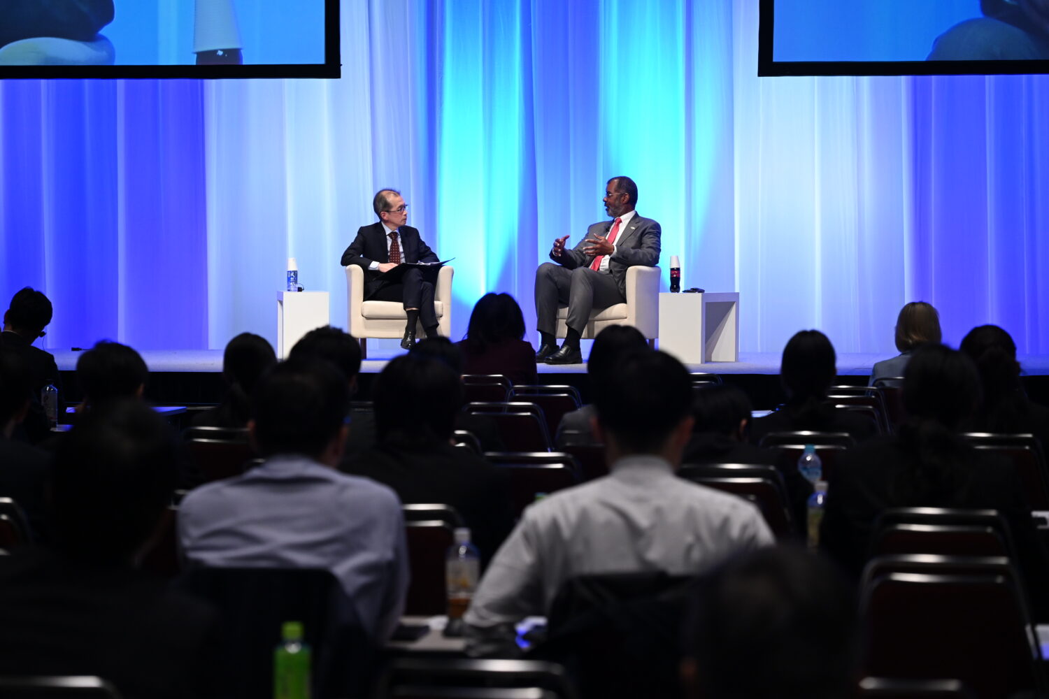 OECD/NEAとの共催で行われたセッション4の冒頭では、NEAのW.D.マグウッド事務局長と、日本原子力産業協会(JAIF)の増井秀企理事長による対談「ファイヤーサイドチャット」が行われた。原子力人材の確保をめぐる課題をテーマに、各国に共通する問題の構造や若年層への訴求の重要性について認識が共有された。対談は、その後に続くパネル討論の導入としての位置づけである。