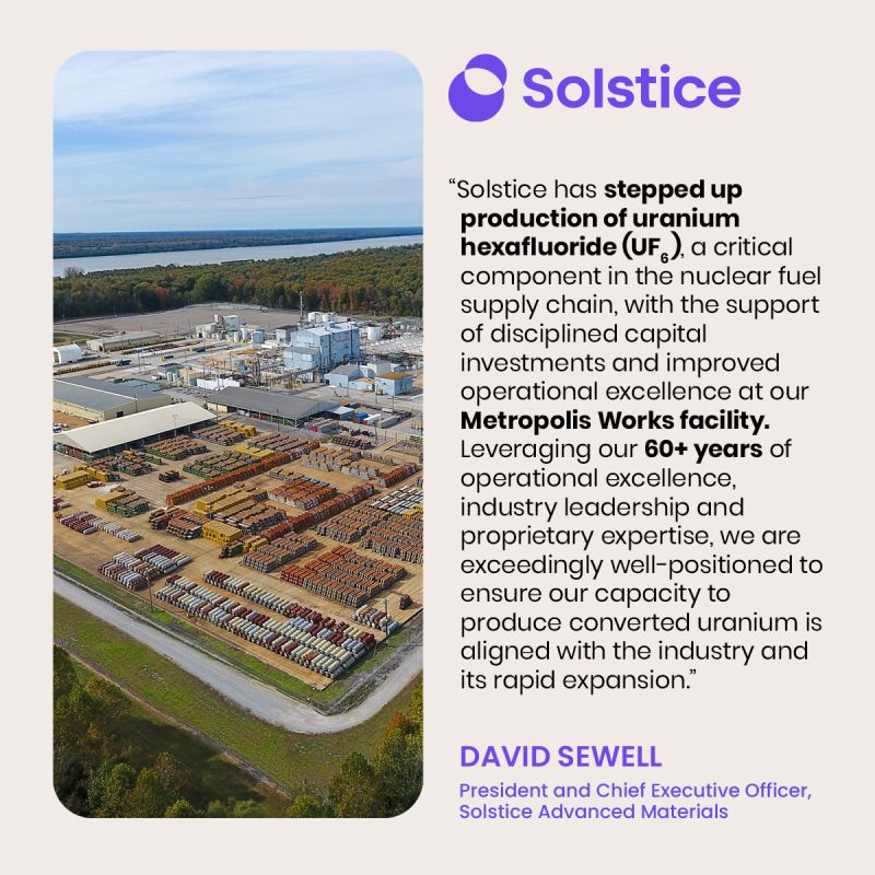 米ソルスティス(Solstice Advanced Materials)社は2月10日、イリノイ州に立地するメトロポリス・ワークス(MTW)プラントにおいて、2026年に六フッ化ウラン(UF₆)の生産量を10,000トン(10kt)へ拡大することを発表した。これは、2024年に計画していた生産能力から約20%の増加となる。ソルスティス社は先端材料の専門企業。2025年10月、米国の多国籍企業であるハネウェル社からスピンオフし、MTWの所有・操業ライセンスを引き継いだ。MTWは60年以上の操業実績がある米国で唯一のUF₆転換施設であり、世界各地の鉱山から供給されるウラン精鉱をUF₆へ転換している。転換後のUF₆は、他事業者による濃縮や燃料加工により、原子炉用燃料として利用。米原子力規制委員会から2060年まで有効な操業許可を取得済みである。同社は、UF₆に対する高い需要を受け、2023年の操業再開以降、MTWでのボトルネック解消プロジェクトに投資。今回の生産規模の拡張は、20億ドル超の受注残高に支えられており、その多くは国内の電力会社など長期顧客からの注文だという。米国が掲げる「2050年までに原子力発電能力を4倍にする」という目標が後押ししていると見ている。MTWは2017年~2023年にかけて、市場環境の悪化により一時的に操業を停止していたが、2023年7月に操業を再開した。米エネルギー省の支援も一部受けながら、ソルスティス社はMTWにおける生産能力増強に向けた新規プロジェクトを検討中。並行して、大手エンジニアリング・調達・建設(EPC)企業を起用し、能力拡張に向けた初期エンジニアリング分析を実施しており、顧客と長期供給に関する協議も開始した。ソルスティス社とゼネラル・アトミックス社の折半出資の合弁会社であるコンバーダイン(ConverDyn)社が、MTWで生産されるすべてのUF₆の独占的販売代理を務めている。