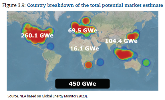 NEAによると、世界の石炭火力発電設備容量(約22億kWe)のうち、2035年までにSMRによるリプレースが見込まれる潜在市場は1億4,300万kWe に達し、主に米国を中心に市場が形成される見通し。さらに2040年には潜在市場が3億8,100万kWeへと拡大し、欧州やアジアでも移行が本格化するとみられる。報告書は、2050年までに世界全体で4億5,000万kWeの石炭火力が原子力へ移行する可能性が高いと結論づけた。なおアジアでは、インドネシアや日本、韓国、フィリピンが潜在市場として挙げられている。