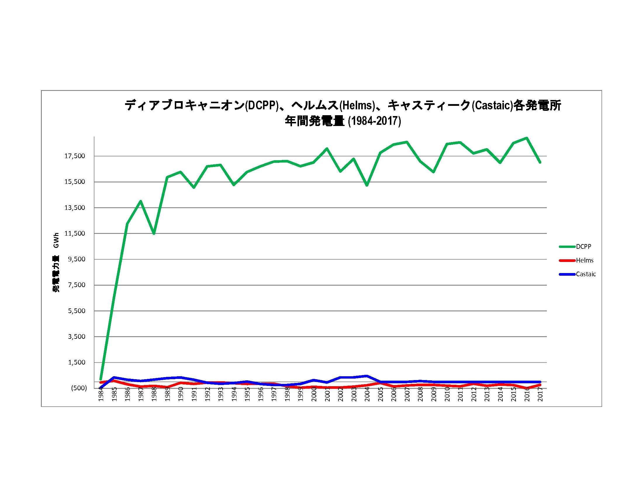 また、CGNPの調査によればカリフォルニアでは系統大での電力貯蔵が行われていないことがわかっている。それは恐らくカリフォルニア電力市場設計に起因していると思われる。米国エネルギー情報局(U.S. EIA)によれば、カリフォルニア州内の2か所の大規模揚水発電所(ヘルムス揚水発電所とキャスティーク揚水発電所)は年間ごく少量の発電を行っているに過ぎない。それは揚水発電所が系統電圧ならびに周波数調整能力を提供することで電力市場からより大きな補填を受けているためだと思われる。(しかもディアブロキャニオン発電所は図の左にあるCAISOが定めた補助負荷集約点[9]Sub LAP(Sub Load Aggregation Point): (訳注)補助負荷集約点は地域毎の混雑料金設定などのために既定負荷集約点(Default … Continue readingZP26区域の電圧並びに周波数安定度維持に大きく貢献しているにもかかわらず、一見したところこうした補填の対象からは除外されていると思われる。ディアブロキャニオン発電所は図中のZP26区域の南西端に位置する。)ヘルムス揚水はカリフォルニア州フレズノの東方約50マイル、シエラ山脈の麓、図中のNP15区域に位置している。(パス15送電線[10] (訳注) 「パス15送電線」はカリフォルニア州内の南北連携送電線の北側)CAISOは最近、カリフォルニア州内のバッテリー蓄電の日々の実績をウェブに掲載している。しかし世界第6位の経済規模と4,000万人にも近づこうとする人口増加をしているカリフォルニア州内の膨大な電力需要に対して、こうしたバッテリー蓄電は現状では3ないし4桁ほども規模が小さなものに過ぎない。ヘルムス揚水の定格容量は121万2千kWであるが、(それはディアブロキャニオン発電所の定格容量224万kWの半分以上である)1984年から2017年のディアブロキャニオン、ヘルムス、及びキャスティーク各発電所の年間発電電力量グラフを見ると、ディアブロキャニオン発電所が年間ほぼ180億kWhの発電を行っているのに対し、ヘルムスのそれは極めて少量であることがわかる。CGNPは申請案件16-08-006の審議に参加したが、その審議の過程でヘルムス揚水がこのように低稼働である理由について、ヘルムス揚水の所有者であるPG&E社に対し公式にデータ提示を要求した。しかしPG&E社はこのCGNPのデータ提示要求を拒絶した。