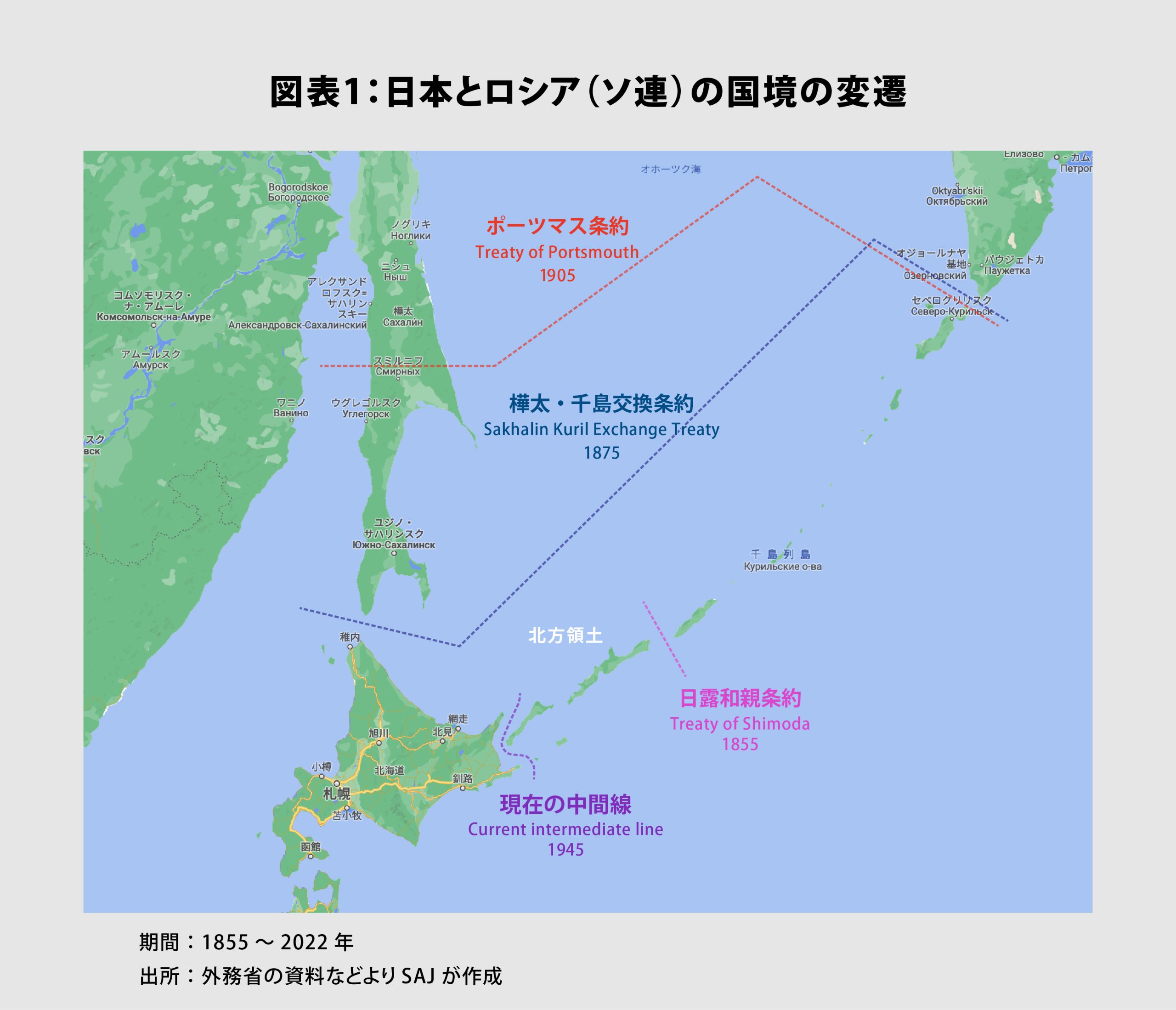 ポーツマス条約は、1904年2月から1905年9月の日露戦争の終戦を決めた条約であり、日本は実質的な戦勝国として樺太(サハリン)の南半分を手に入れた(図表1)。一方、千島列島は、1875年5月7日にロシア帝国と締結した『樺太・千島交換条約』により、日本が平和裏に領有権を得た領土だ。