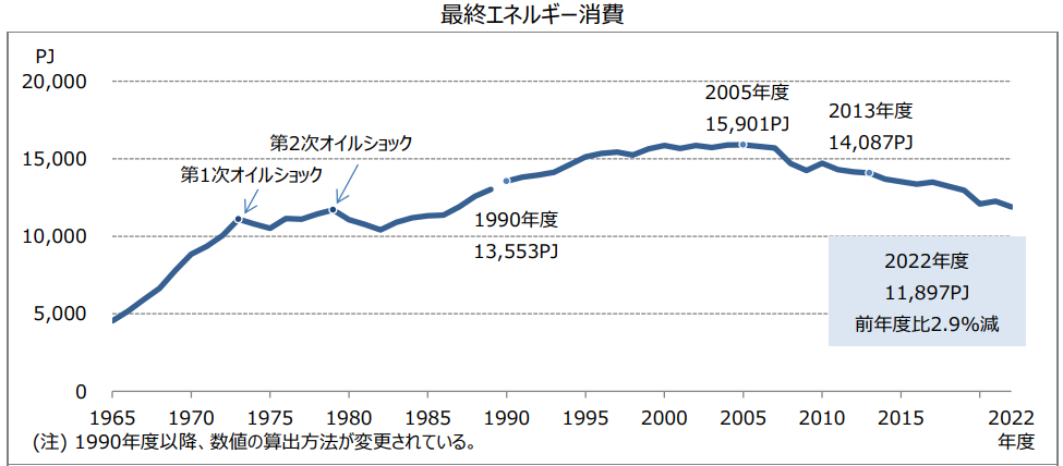 資源エネルギー庁は11月22日、2023年度のエネルギー需給実績(速報)を発表した。〈発表資料は こちら〉再生可能エネルギーの増加、原子力発電の再稼働により、脱炭素電源比率は31.4%にまで上昇。エネルギー自給率は15.2%と、いずれも東日本大震災以降で最高となった。最終エネルギー消費は、前年度比3.0%減の11,476PJと、2年連続の減少。企業・事業者他部門が製造業の生産活動停滞により、家庭部門がテレワーク実施率の低下などにより、各々減少したことが要因とみられている。最終エネルギー消費は、1990年以降で算出方法に変更がなされているが、1980~90年代のバブル期に上昇し、2000年代初頭でピークに達した後、近年、減少傾向にあり、1970年代のオイルショック時の水準に近付きつつある。一次エネルギーの国内供給は、前年度比4.1%減。化石燃料が同7.0%減となる一方、非化石燃料は10.6%増で、水力を含む再生可能エネルギーは11年連続で増加した。そのうち、原子力は再稼働の動きに伴い、同51.2%増と躍進。最近10年では最も高い供給量となった。2023年度中は、関西電力高浜1、2号機がそれぞれ7、9月に再稼働している。発電電力量は、前年度比1.6%減の9,854億kWhとなり、2010年度以降で最小。非化石燃料のシェアは東日本大震災以降、初めて30%を越え31.4%となった。エネルギー起源のCO2排出量は、前年度比4.8%減、2013年度比25.9%減の9.2億トンとなり、1990年以降で最小を更新。企業・事業所部門では初めて5億トンを下回った。電力のCO2排出原単位は同4.1%減となる0.45kg-CO2/kWhだった。